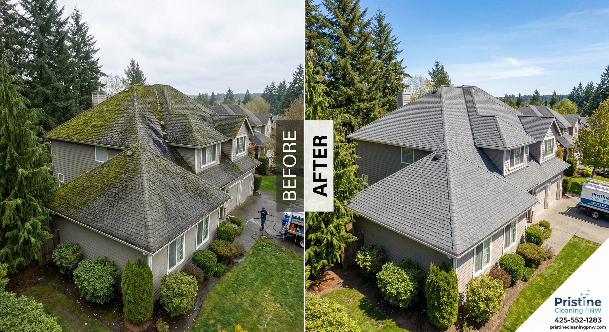 At Pristine Clean Interior Solutions, we serve homeowners across Snohomish County and King County — from Everett and Bothell to Bellevue and beyond — with professional-grade treatments and precision techniques to restore your roof safely and effectively, without the risks of DIY pressure washing or cheap chemical sprays.
